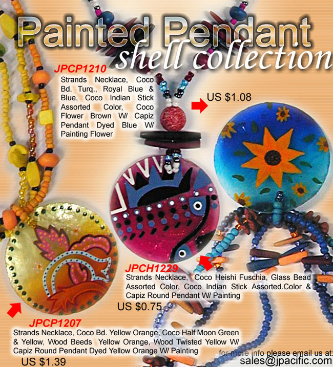 | Capiz Shell Pendant Necklace Collection made of coco beads, coco chips, coco indian stick, assorted glass beads, pearlize beads, wood beads, coco heishi and capiz pendants in different color and design. |